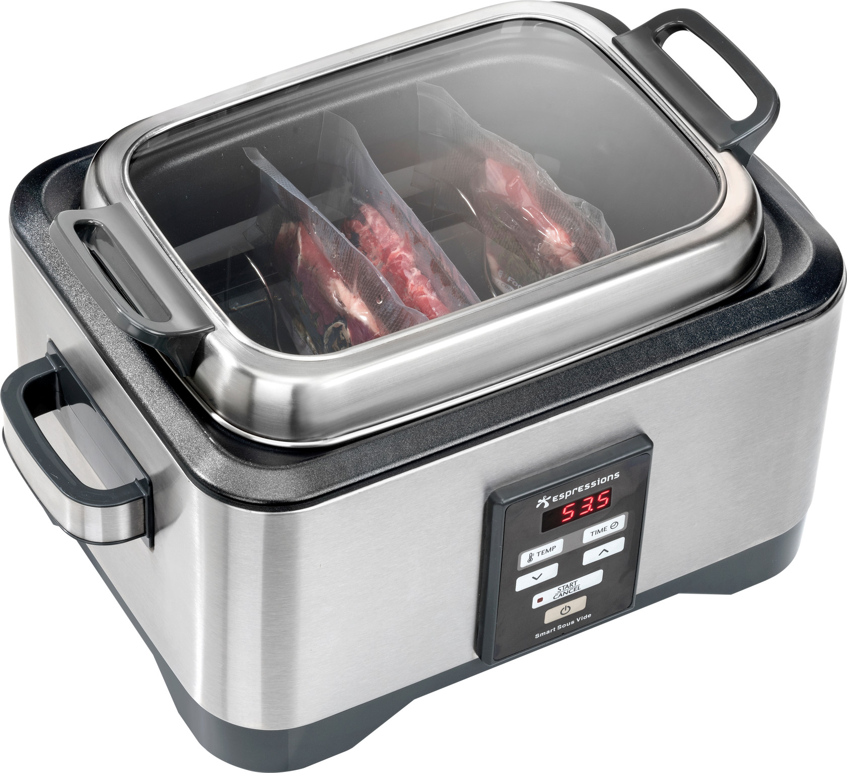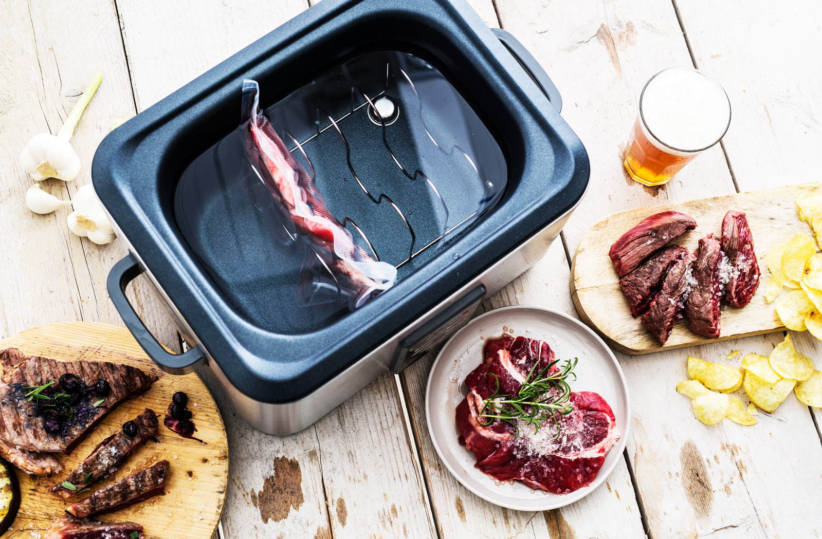 Discover the secret of top chefs for yourself: Vacuum-seal meat, place the vacuum bag in the preheated water in the appliance, and set the timer. Because the meat cooks in a sealed bag, outside factors are unaffected. When the alarm sounds, the meat is perfectly tender and incredibly flavorful.