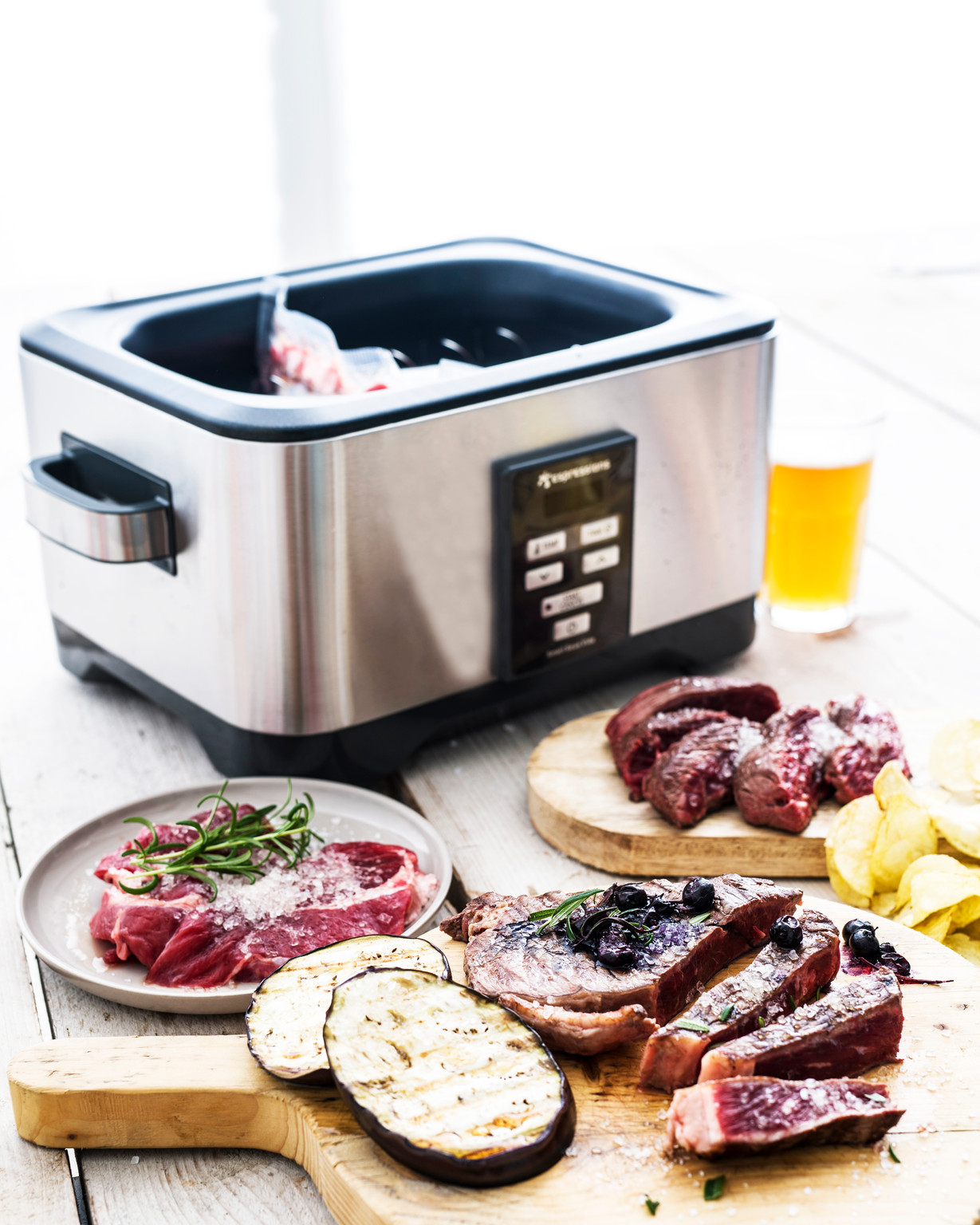 Sous-vide (French for "under vacuum") involves heating vacuum-packed food using steam or a water bath at a relatively low, constant, and precise temperature (approximately 0.1°C) for an extended period. By heating the food below boiling point, it cooks slowly but steadily through, while meat, for example, remains perfectly tender and all the juices, and therefore flavors, are preserved. In short, evenly cooked food with maximum flavor, and what's more, it's incredibly easy to use. Sous-vide is truly for everyone!