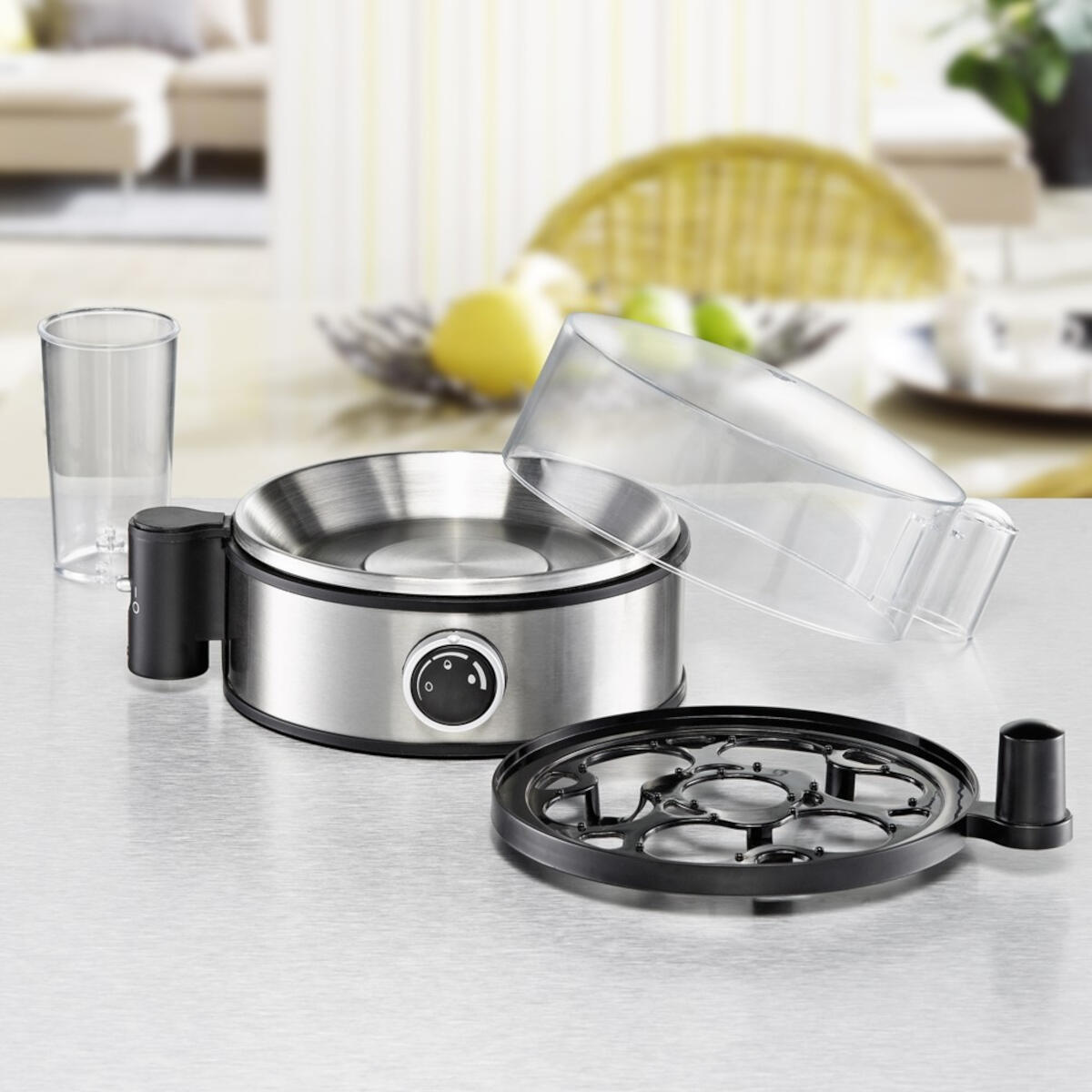 - Eierkoker: Met een roestvrijstalen verwarmingskom en uitneembaar inzetstuk voor het koken van maximaal 7 eieren.