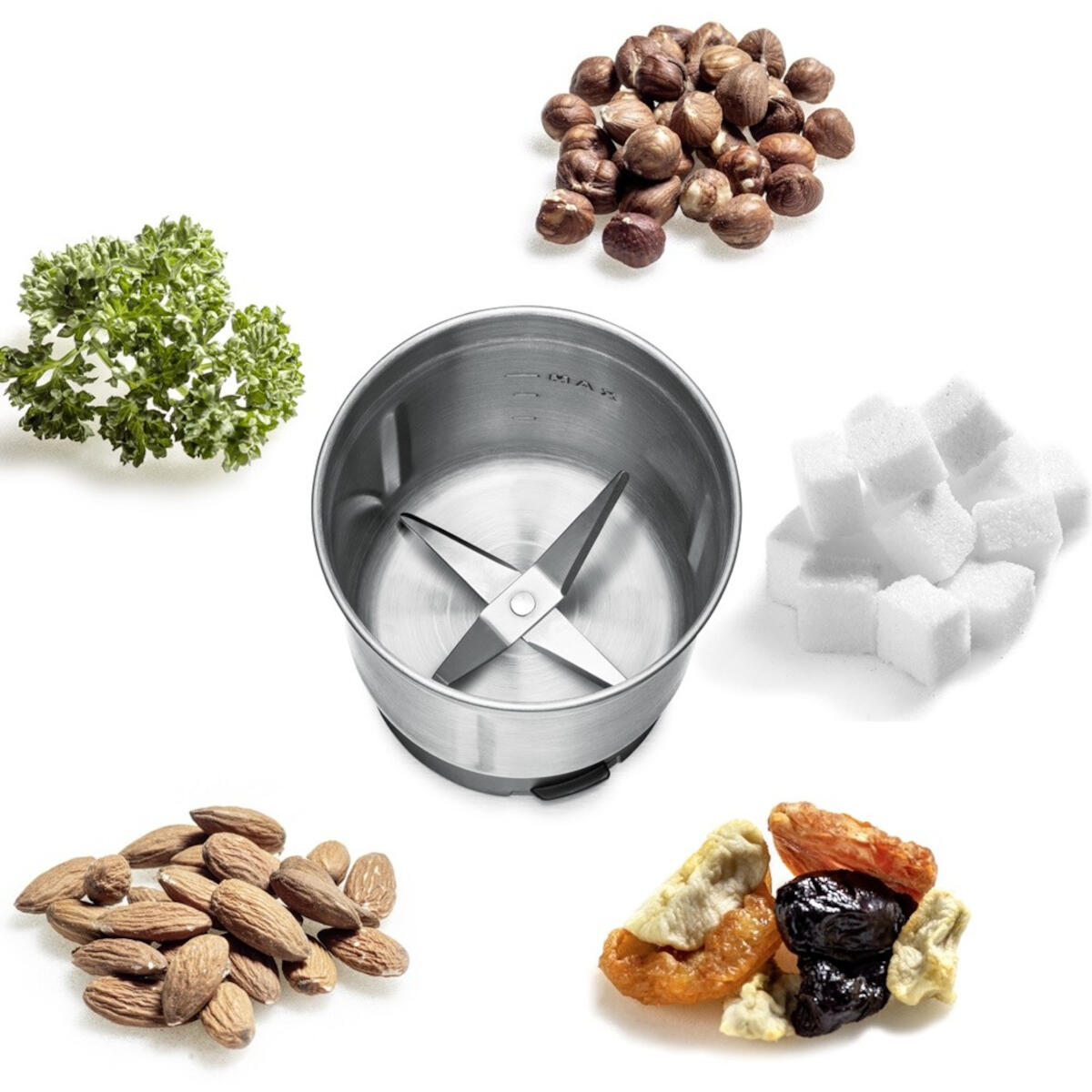 - Krachtige 200 W-motor: zorgt voor het snel en efficiënt malen van koffiebonen, specerijen en kruiden.