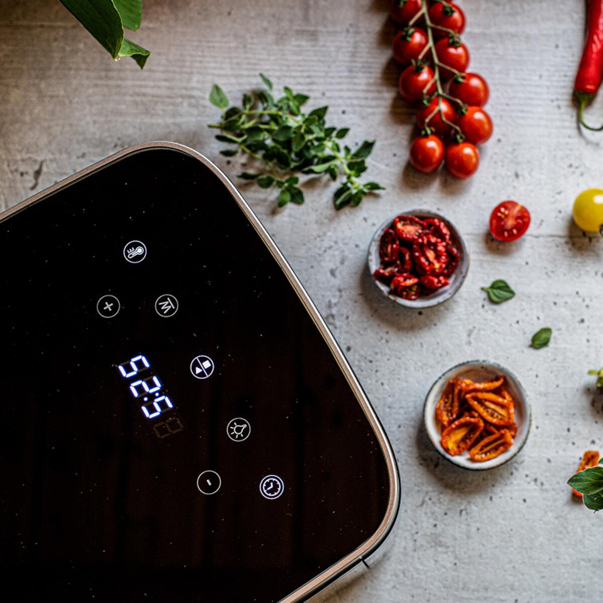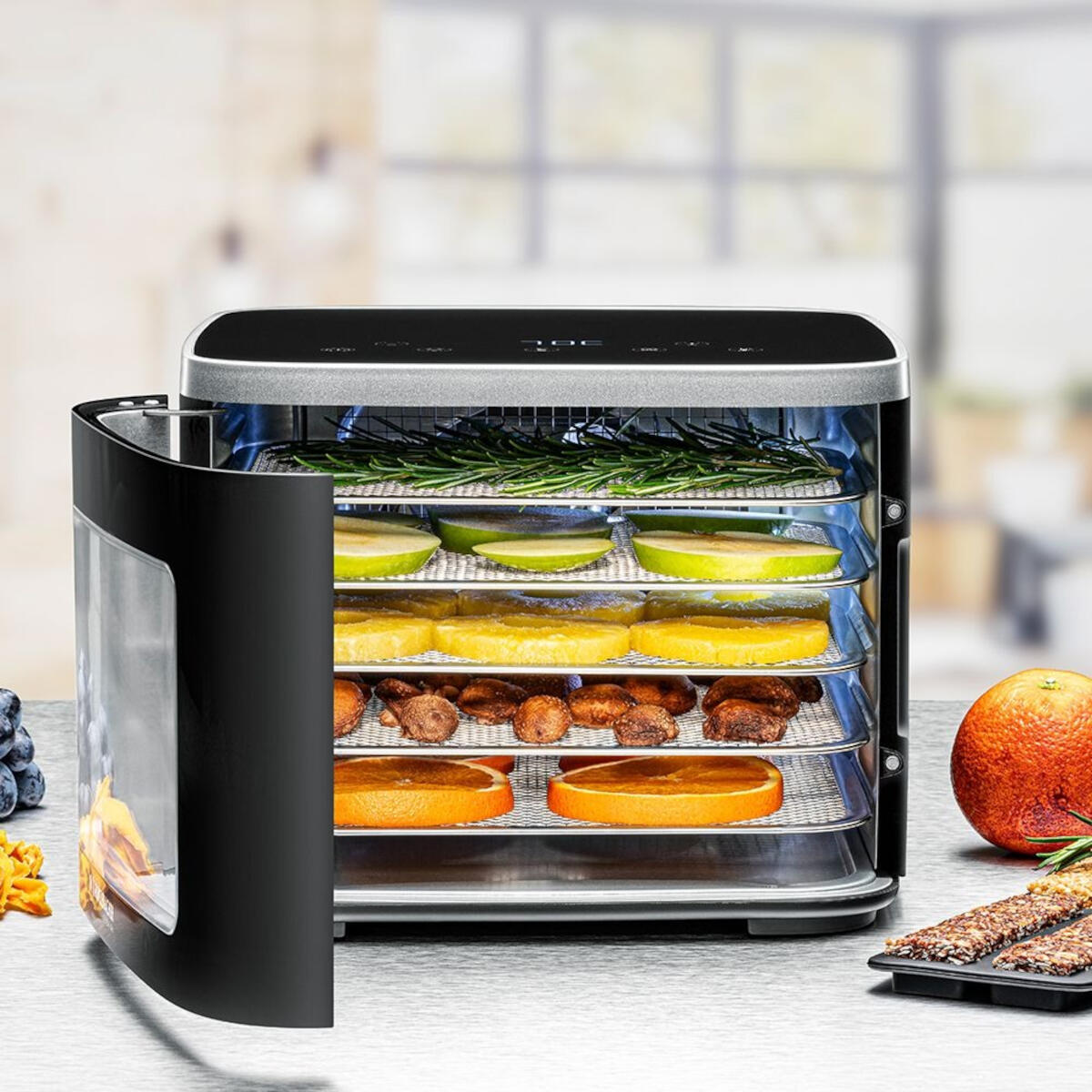 - Temperatuurregeling: Nauwkeurig en individueel instelbaar van 35 °C tot 80 °C, ideaal voor het voorzichtig drogen van snacks of ingrediënten.