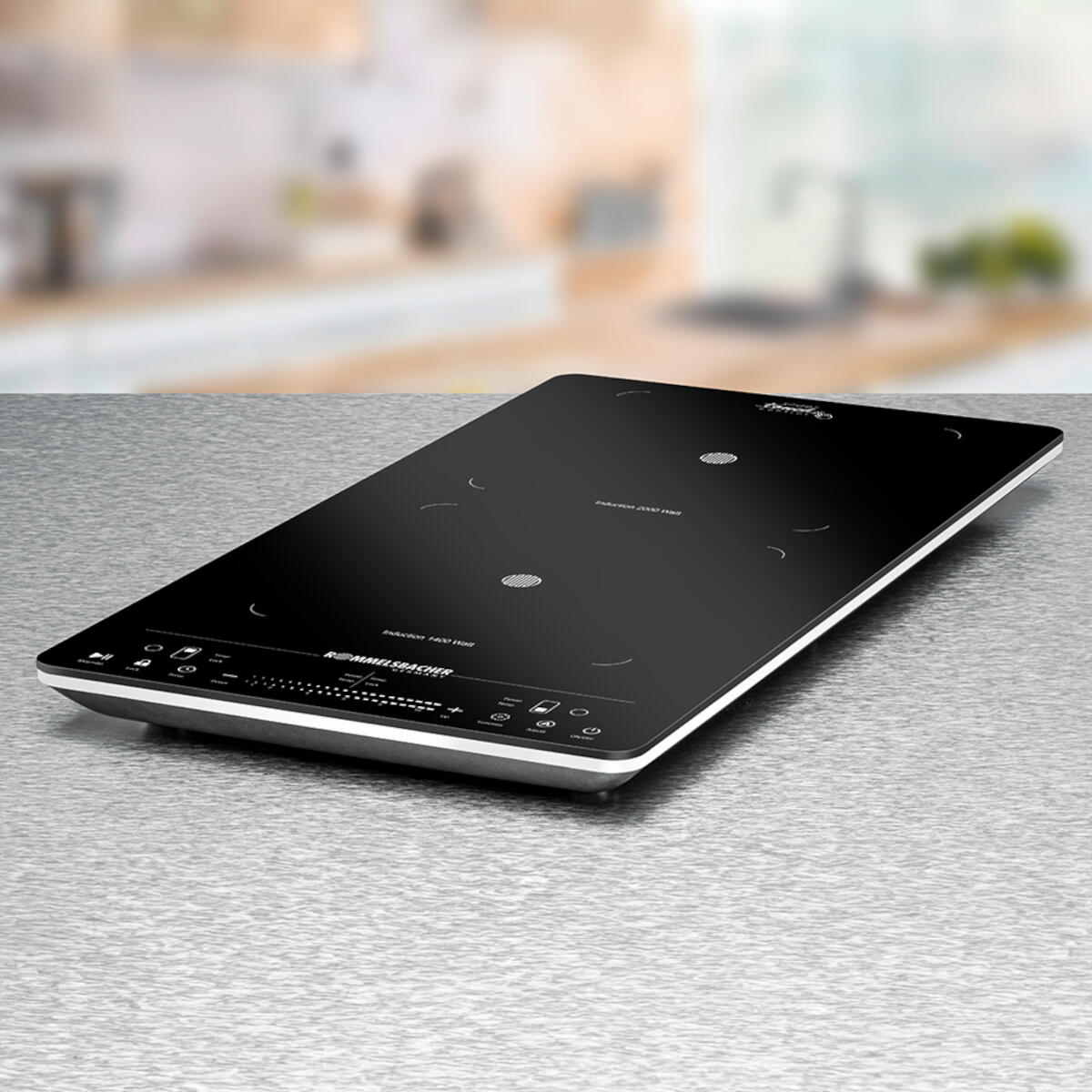 - Dubbele inductiezones (120–260 mm diameter) met hoog vermogen (2000 W + 1400 W) voor veelzijdig en nauwkeurig koken.