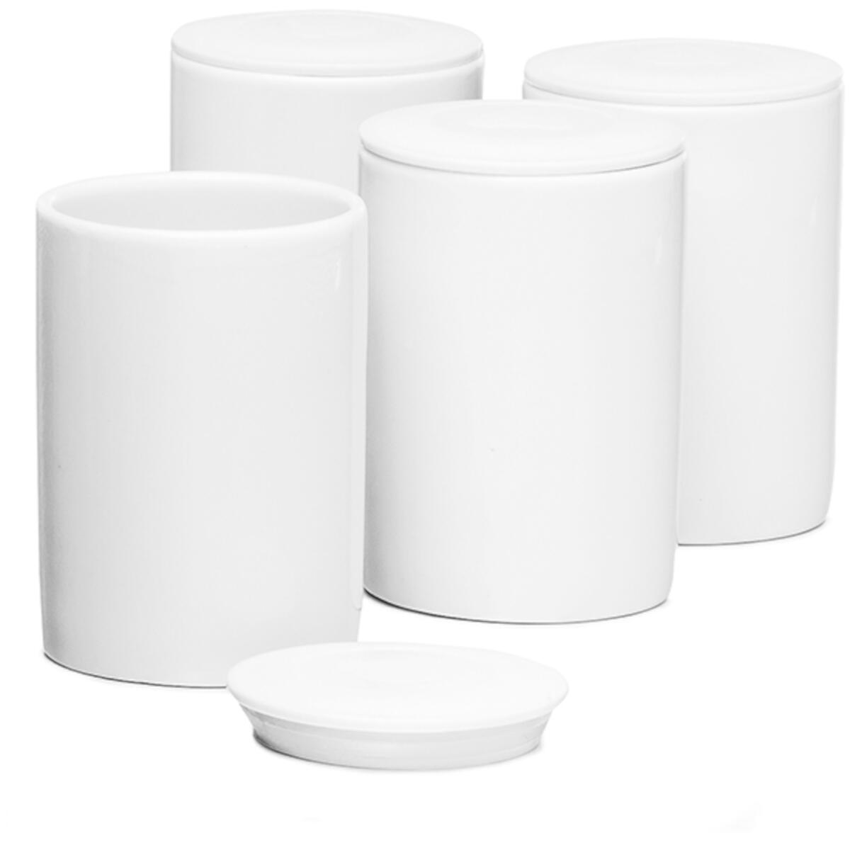 - De set bestaat uit vier keramische bekers, elk voorzien van een eigen deksel