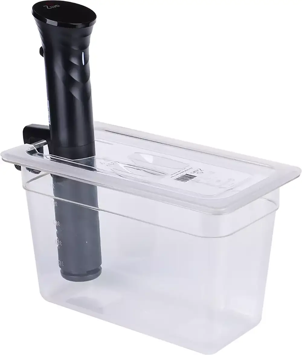 Beleef een optimale sous-vide kookervaring met onze kleine Gastronorm sous-vide watercontainer, speciaal ontworpen voor ervaren hobbykoks. Deze transparante watercontainer, gemaakt van kras- en slijtvast polycarbonaat, biedt zowel gemak als een professionele uitstraling in uw keuken. Bewaar uw sous-vide apparatuur in deze container, zodat u alles bij de hand hebt voor uw sous-vide kookavonturen. Deze hoogwaardige Gastronorm sous-vide containers zijn bestand tegen temperaturen tot 110 °C. Bovendien heeft het deksel een uitsparing voor sous-vide sticks met een diameter tot 65 mm (onderkant). Dit maakt ze nog veiliger en betrouwbaarder in gebruik, zelfs met kinderen in huis. Houd er rekening mee dat de buitenkant van de container warm kan worden tijdens het koken.